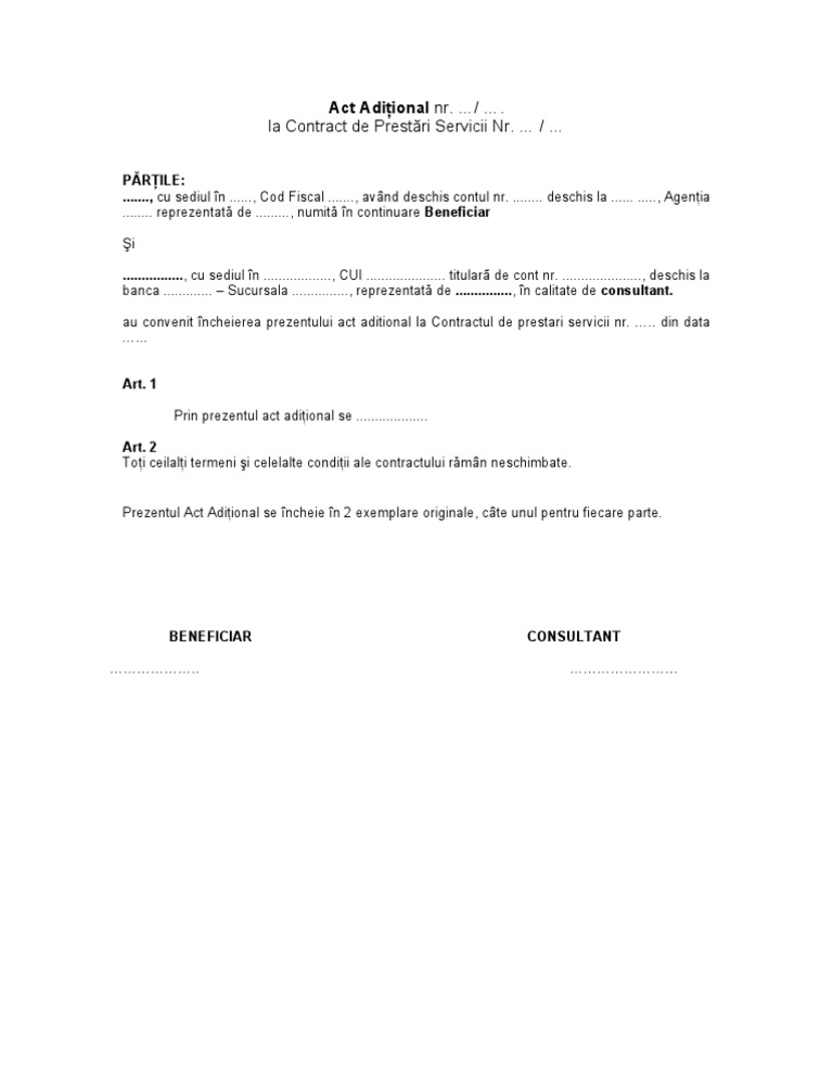 Actul adiţional la contractul de muncă reprezintă un document care se încheie în momentul apariţiei unei modificări la unul dintre elementele obligatorii. Prelungirea contractului de inchiriere se face numai cu acordul scris al partilor semnatare, in baza cererii depuse de catre locatar si a actului aditional la prezentul contract. Model de act aditional de reziliere contract individual de munca october 2019 6,211. Acum au expirat cei doi ani si doresc sa fac un act aditional de prelungire a contractului cu inca 2 ani sau pe durata nedeterminata. Copierea de continut din prezentul site este supusa regulilor precizate in termeni si conditii!