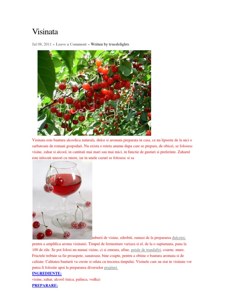 viʃiˈnatə) is a romanian alcoholic beverage produced from sour cherries (vișine in romanian), sugar and alcohol. Evita depozitarea in sticle de plastic! Reteta de visinata facuta acasa este gata!