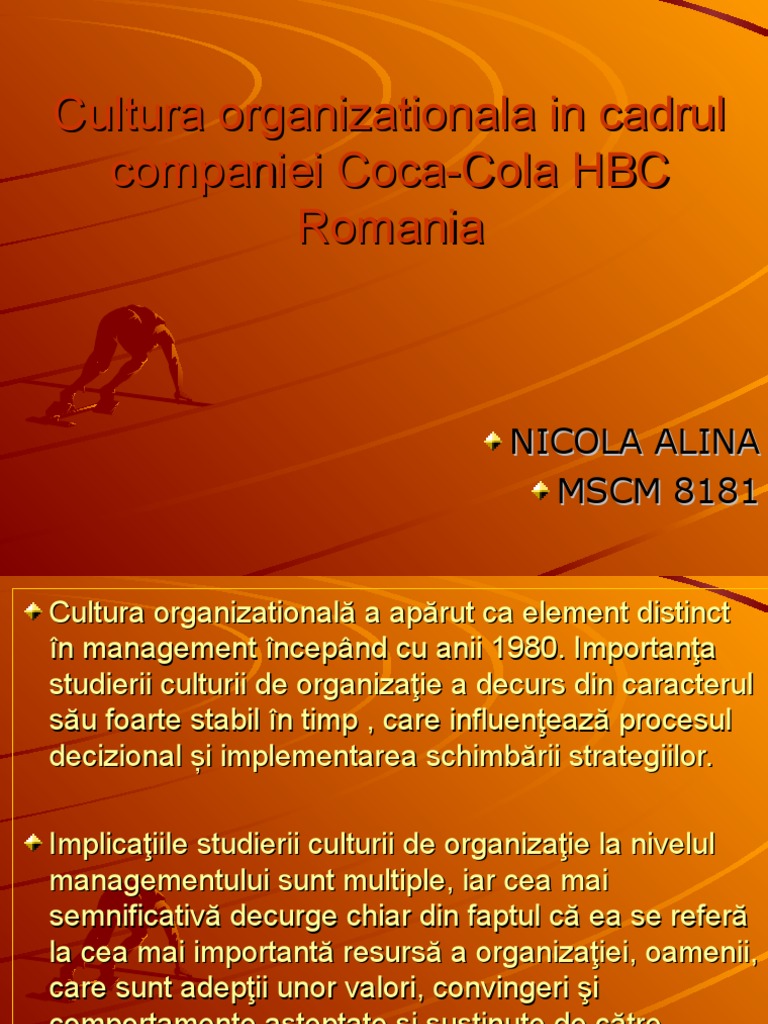 Cultura organizationala poate fi definita drept un complex specific de valori, reprezentri, n elesuri, credine conductoare, ci de gndire mprt ite de membrii unei de altfel, coca cola hbc romania a devenit n ultimii ani un adevrat exportator de manageri: The coca cola company was founded in 1892 by asa griggs candler. Being divided by geographic region enables the company's operations to be tailored to individual markets in different areas.
