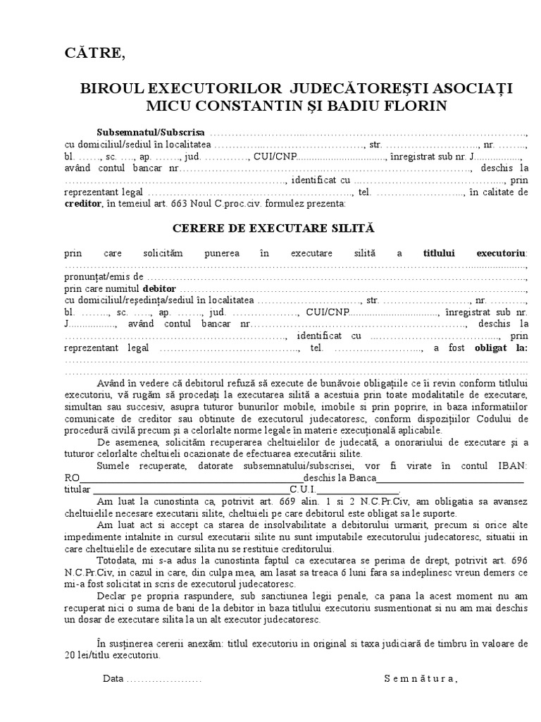 7 cod procedura civila suspendarea provizorie a executarii silite demarate impotriva sa, masura ce dureaza in timp pana la solutionarea cererii de suspendare a executarii silite formulata odata cu cererea de. Executarea silită se suspendă în cazurile în care aceasta este prevăzută de lege ori a fost dispusă de instanţă. Axul executarii silite fiind atributul de imperium al judecatorului.